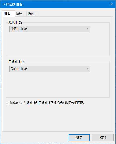 在出現的“IP篩選器屬性”對話框中,“地址”選項卡中,“源地址”選擇“任何IP地址”,“目標地址”選擇“我的IP地址”;
