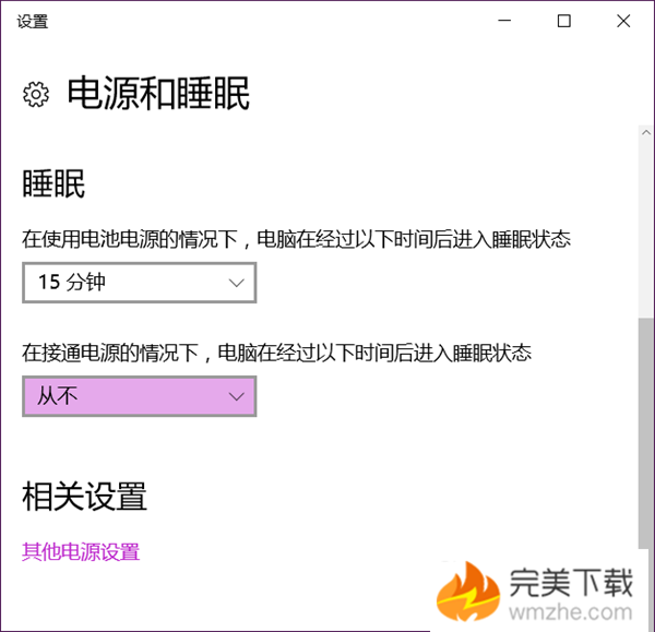 7、按下開始菜單,輸入“電源”彈出設(shè)置界面,下拉找到“睡眠”,選擇“從不”即可(接通電池的情況下還是默認不改為好)。