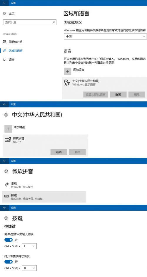可在【設置】>【時間和語言】>【區域和語言】>【中文】選項>【微軟拼音】選項>【按鍵】中設置,將按鈕設為非激活的狀態即可。