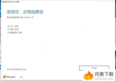 5、注意,Win10企業(yè)版用戶無法通過該方法實現(xiàn)更新。后來小編借用同事的電腦,進行接下來的更新步驟。電腦正常兼容后,點擊“下一步”。