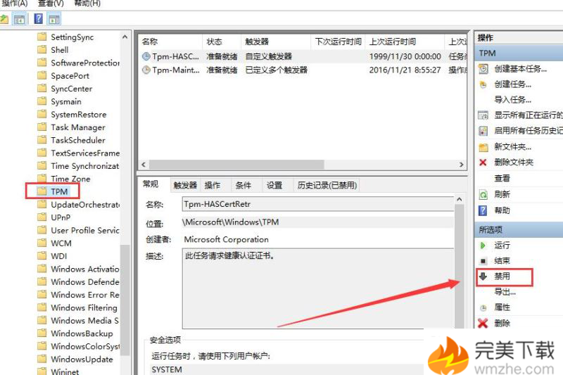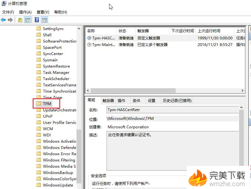 2、在界面中,依次展開:任務計劃程序/任務計劃程序庫/microsoft/windows/tpm,如圖所示: