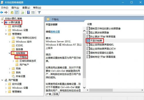 2、依次展開并定位到“計算機配置→管理模版→控制面板→個性化”,在右邊窗口中找到“不顯示鎖屏”一項。