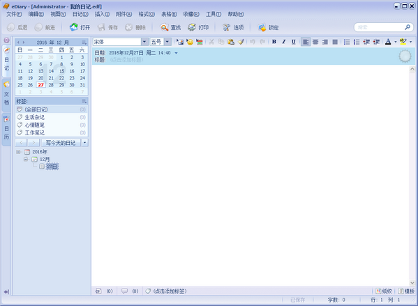 eDiary電子日記本是一款用于在電腦上寫日記或收集文檔的軟件。支持常用的文字編輯排版功能,具有高強度的保密性。eDiary的作用不僅僅在于寫日記,您也可以用它來記流水帳、寫工作日志,記錄學習心得,或者用它來管理你的日常文檔。eDiary以時間為主線,以文字為載體,記錄你的心路歷程。