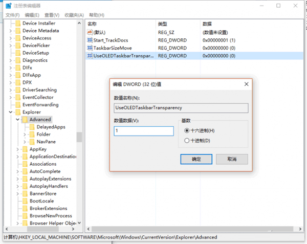 在右側(cè)新建個名為UseOLEDTaskbarTransparency的DWORD(32位)值,并將數(shù)值數(shù)據(jù)修改成為1。之后注銷當前賬戶或重啟資源管理器就能看到更為透明的任務欄了。