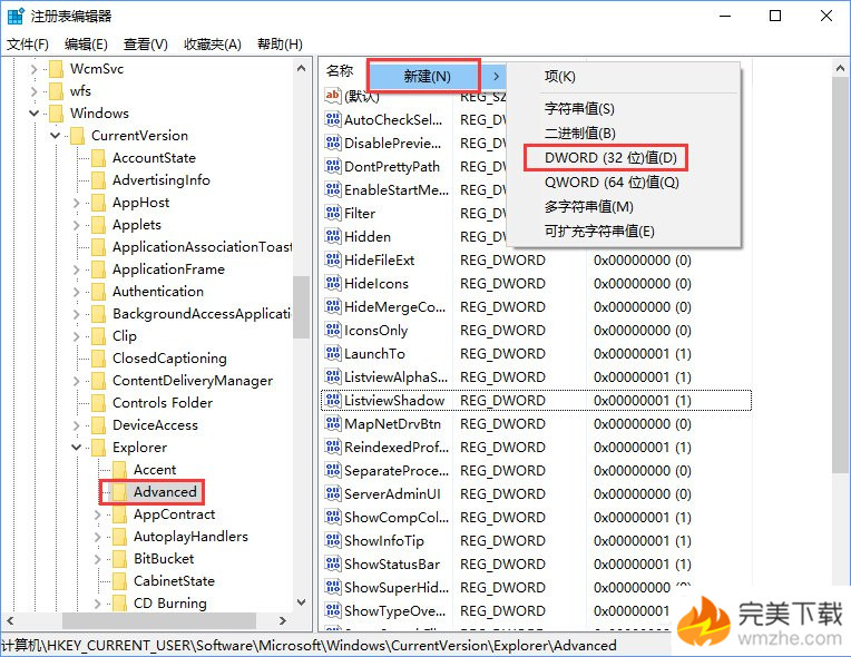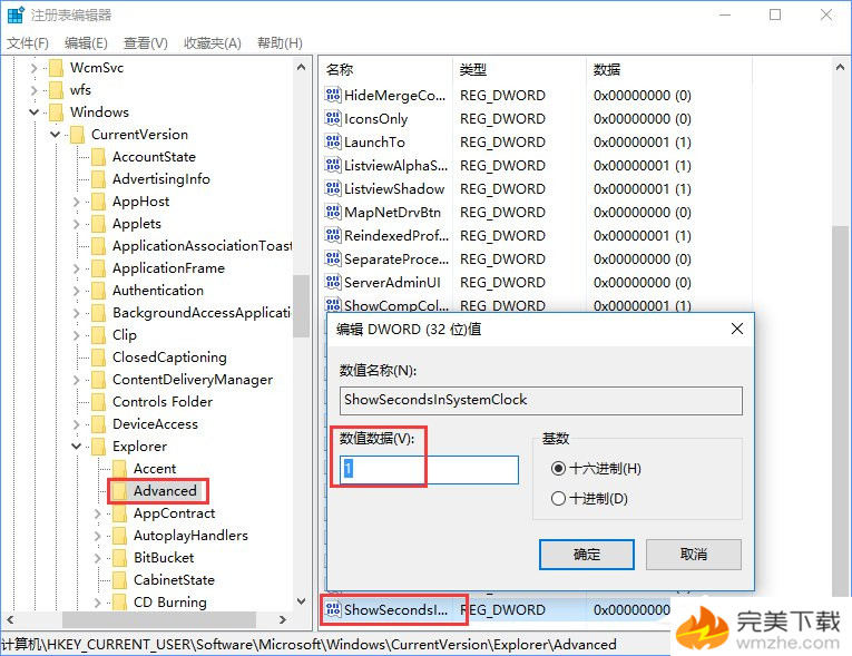 HKEY_CURRENT_USER/SOFTWARE/Microsoft/Windows/CurrentVersion/Explorer/Advanced,新建DWORD(32位)值,命名為ShowSecondsInSystemClock;