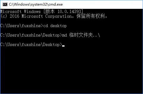 2、之后打開命令提示符(Win+R組合鍵后輸入CMD),提示符一般都會在C:/Users/fuxshine(用戶名)這一層,接下來只要輸入cd desktop就能進(jìn)入到桌面路徑了,之后使用輸入以下命令: