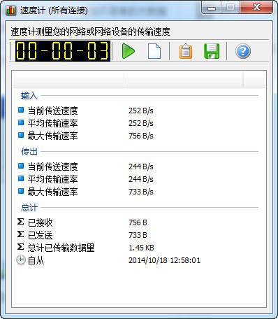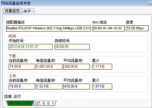 選中要監視的網卡后 ,程序會實時顯示當前網卡的流量信息,包括: