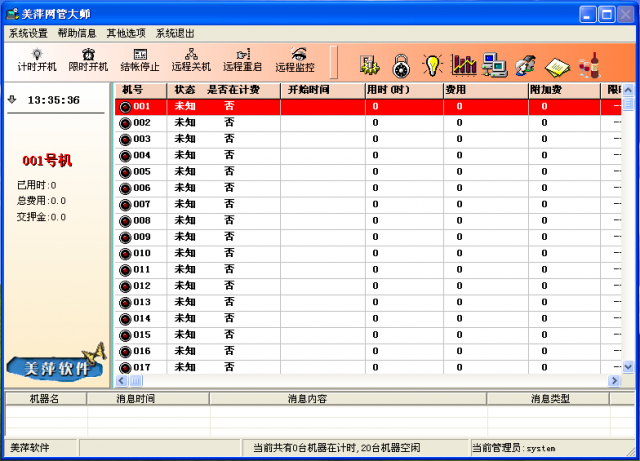 美萍網管大師是款網吧必備的網吧管理系統。它集實時計時計費,計帳于一體,即可單獨作為網吧的計費管理機,也可配合安全衛士遠程控制整個網絡內的所有計算機。可對任意機器進行開通停止、限時、關機、熱啟動等操作,并且具有會員制管理、網吧商品管理、每日費用統計等眾多功能,是管理網吧、電腦游戲房、培訓中心等復雜場合的純軟件管理解決方案。