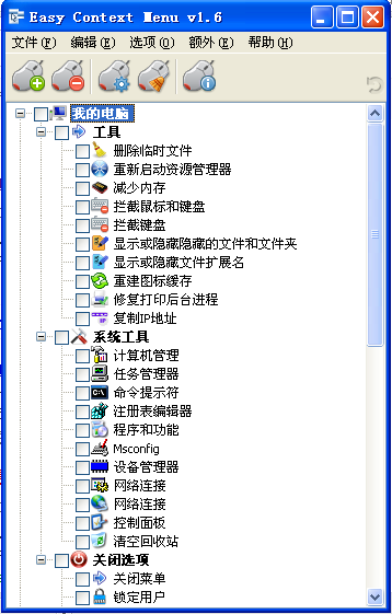 Easy Context Menu軟件支持管理桌面右鍵菜單、我的電腦右鍵菜單、驅動器右鍵菜單、文件右鍵菜單、文件夾右鍵菜單、系統工具子菜單、關閉計算機子菜單。
