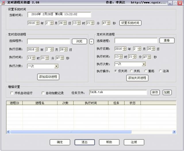 定時進程關閉器是一款定時關閉電腦程序的軟件,可以定時打開進程、執(zhí)行文件,定時關閉進程,定時關機,系統(tǒng)啟動時運行自動加載任務,保存任務,加載任務,調(diào)整系統(tǒng)時間,顯示系統(tǒng)的所有進程等。