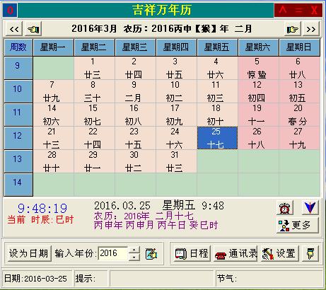 吉祥萬年歷是一款可以同時(shí)顯示公歷、農(nóng)歷、節(jié)氣、國際節(jié)日、年月日時(shí)干支、生肖、時(shí)辰的電子日歷,并附帶一個(gè)十分輕巧的桌面時(shí)鐘,而且內(nèi)附有鬧鈴,你有事可以用它來提醒等軟件,事件提醒器會(huì)提醒你重要的日期或是時(shí)間,你可以設(shè)定提醒的次數(shù)是每日、每星期、每日或是每一年;并有日程安排管理,你可以隨意設(shè)置提示音及鬧鈴;界面配置魔術(shù)師;自定義節(jié)日:可將你喜歡的節(jié)日或你的生日定義到日歷當(dāng)中,使日歷更具個(gè)性化;通訊錄管理:將你的通訊錄分類管理;條型化窗口:把電子臺(tái)歷縮小到如同不知不覺背單詞一樣的小窗口條,節(jié)省了屏幕空間。 設(shè)置非常靈活、查看非常方便!