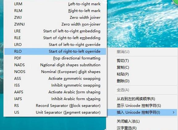 4.在重命名的時候,繼續點擊右鍵,然后選擇「插入Unicode控制字符」,然后選擇任意字符就可以了,如下圖所示。