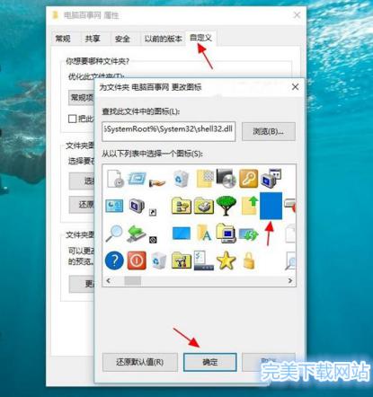2.在打開文件夾屬性界面,切換到「自定義」選項,然后點擊「更改圖標」,之后選擇更改為“空白圖標”,并點擊下方的「確定」保存,如下圖所示。