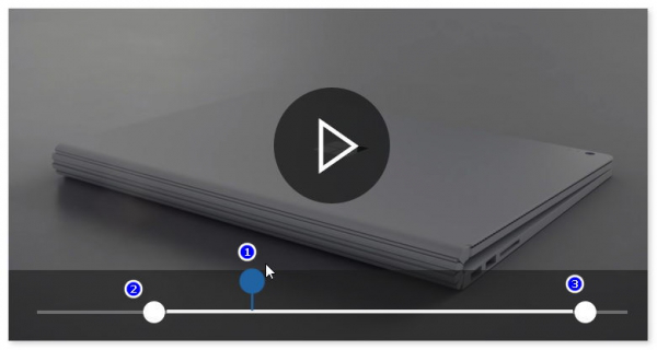 3、拖動藍色圓圈(標記1),可以進行實時預覽視頻,拖動兩側的白色圓圈(標記2、3)可以選擇重新影片的開頭與結尾;