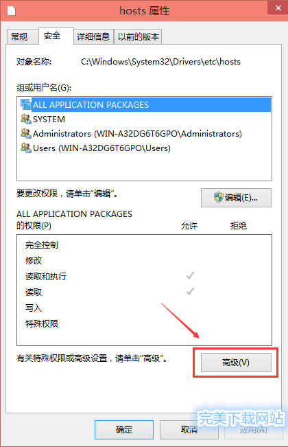在hosts的高級安全設置界面點擊更改權限,如下圖所示。