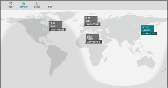 經常外出的人,常會遇到時差的煩惱。其實一個最簡單方法,就是把你當前所在地及目的地位置輸入到“鬧鐘與時鐘”內。輸入完成后,win10會自動在世界地圖上標出不同地點下的當前時間。還可以借助右下角按鈕,以預覽的方式查詢不同地點間的時間,非常直觀。