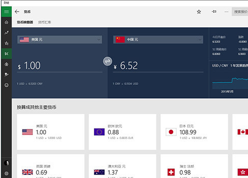 匯率變化太快,不同貨幣間的換算起來就挺麻煩的。其實在Win10內置的“財經”應用中,便隱藏著一項實時貨幣換算功能。只要在左側欄點擊“貨幣”標簽中選擇要換算的兩種貨幣。Win10就會根據實時匯率自動計算出兩種貨幣間的兌換比率,同時下方還會給出其他主要貨幣間的匯率情況。