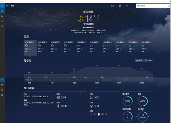 Win10內置的“天氣”組件大家都用過吧,在天氣”組件中,你可以查詢最近10日的天氣預報,查詢逐小時的氣溫曲線圖,查看降水概率、風力、濕度,以及每天的日出日落及月出月落時間。像歷史月份降雨量及歷史月份氣溫表都能查到。最厲害的是,它還可以聯合Cortana向用戶及時發出下雨預警或降溫預警,提醒用戶及時添減衣物。