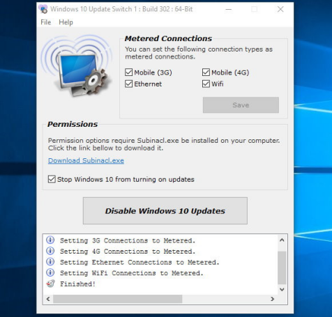 Windows 10 Update Switch禁用自動更新的方式非常獨特,而且可以隨時隨地開啟或關閉。它利用的原理是把網絡偽裝成計費流量模式,因為如果你處于按流量計費的網絡連接中,Windows 10系統就不會自動更新你的系統。而Windows 10 Update Switch就是利用這點讓系統認為你的當前網絡是按流量計費的。