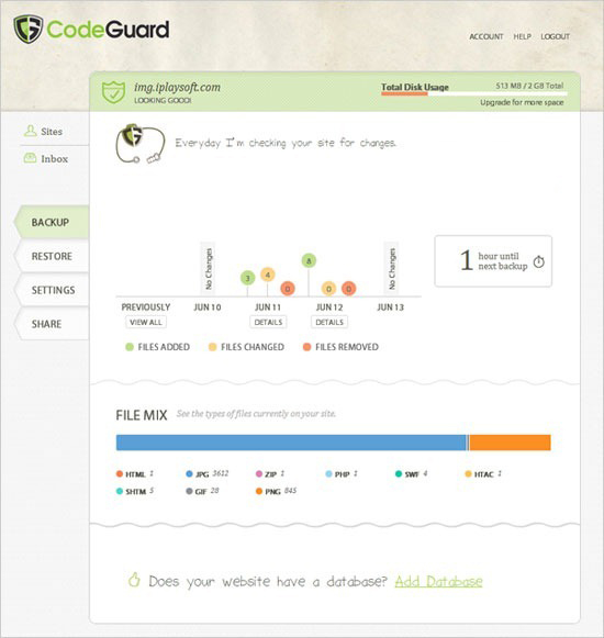 CodeGuard最大特點(diǎn)就是全自動(dòng),新手小白和懶人真的必備啊!CodeGuard能讓站長(zhǎng)們方便地備份和恢復(fù)自己網(wǎng)站的文件數(shù)據(jù)和數(shù)據(jù)庫(kù)。也能很好的保護(hù)你的網(wǎng)站代碼!CodeGuard 采取了差異備份的方式,首次完整備份之后,就算你對(duì)網(wǎng)站內(nèi)容的進(jìn)行修改,它也只會(huì)再傳輸修改的部分,大大節(jié)省了備份時(shí)間和儲(chǔ)存所需的空間。
