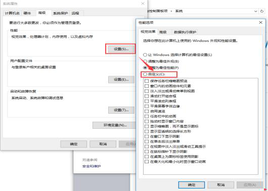 點擊【性能】下面的設(shè)置按鈕,取消勾選一些沒有用的視覺特效。