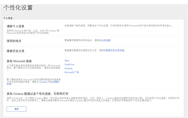 第四步:在登陸顯示的”個性化顯示“界面里,清除選項“其他Cortana數據以及個性化語音、印刷和打字”,完整這些步驟后,我們在云端隱私數據就會被清除掉了。
