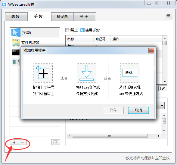 除了預設的一些軟件全局手勢外,用戶還可以自定義添加手勢,手勢可以只針對某款軟件。比如用戶可以在 Google 瀏覽器中添加強大的鼠標手勢功能,而因此軟件不必再安裝那些不好用的鼠標手勢插件。如下圖添加應用程序來看: