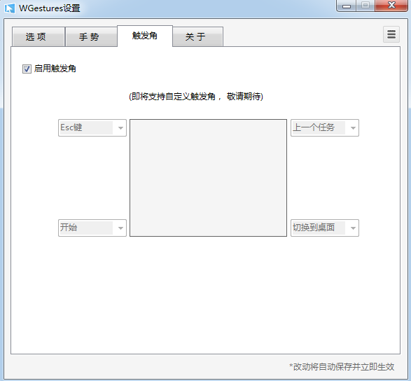 WGestures 的鼠標手勢還可以直接設置軟件屏幕四個觸發角功能,設置您所需要的功能,完成后,您需要觸發什么操作,直接鼠標移到相應角落就可以了。除此之外,您還可以自定義鼠標手勢。