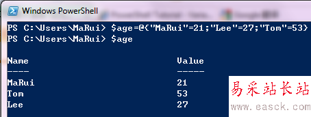 $age=@{} <enter> "MaRui"=21;"Lee"=27;"Tom"=53
