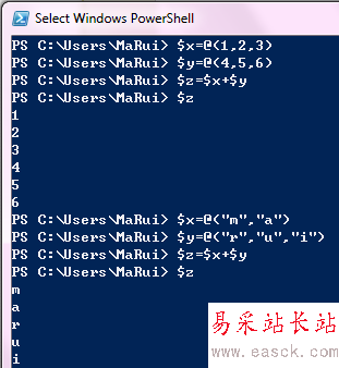 在PowerShell中,聲明一個變量為數組時,需要使用符號"@",例如:
