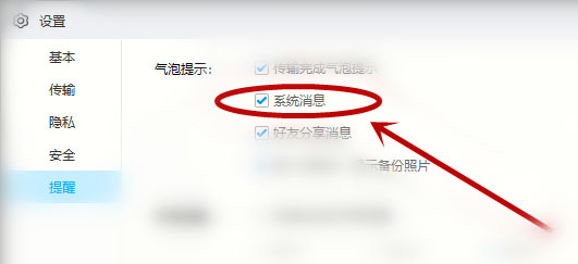 5、在右邊窗口,選擇【氣泡提示】選項組中的【系統消息】選項。該選項默認是勾選打開的