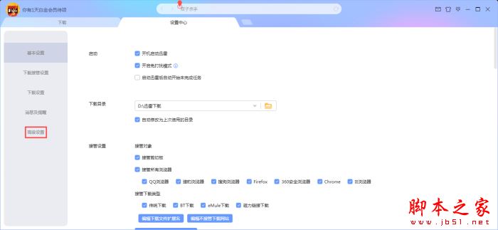 打開迅雷X,依次選取“主菜單”、“設置中心”;