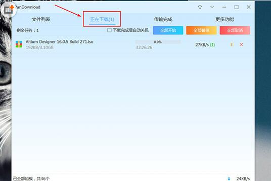 4、大家可以在“正在下載”中找到正在下載的文件,在文件的下方有下載時間可供參考,不過PanDownload會因為資源的不同導致下載速度發生變化,所以需要用戶自己尋找合適的資源,現在有一款下載神器擺在面前卻不好好珍惜,等之后失去了回過頭來想想可能是后悔莫及,趕快來試試傳說中的“網盤下載神器”吧,如下圖所示:
