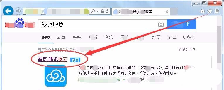 2、搜索區(qū)中,找到騰訊微云官網,點擊進入。