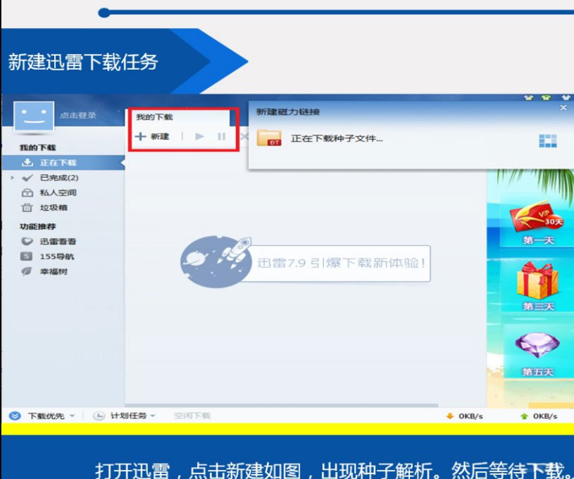 4、打開迅雷,點擊新建如圖,出現種子解析。然后等待下載。