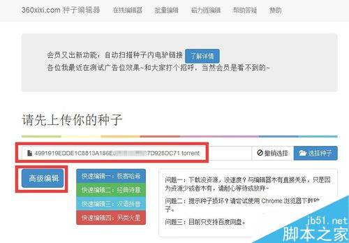 當利用“百度云管家”離線下載功能時,出現“離線下載錯誤[36000]”的提示時,表明Bt種子文件“非法”。由于百度云基于Bt種子特征碼進行識別,因此我們首先需要將Bt種子進行修改。對于進入如圖所示的“種子編輯器”網站,選擇上傳需要編輯的Bt種子文件,點擊“高級編輯”按鈕。