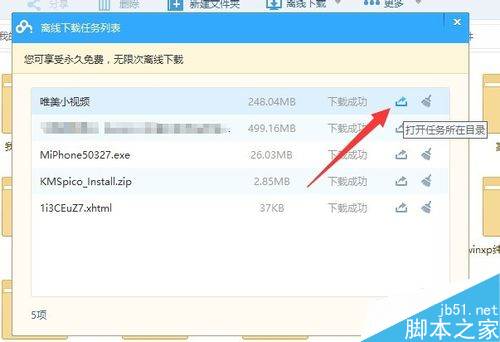 此時將打開“離線下載任務列表”窗口,從中就可以查看正在下載的離線任務進度情況,當離線下載成功后,點擊對應視頻右側的“打開任務所在目錄”按鈕。