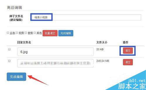 此時將顯示“高級編輯”界面,在此可以修改“種子文件名”,同時還可以對種子所包含的文件進行部分“清除”操作,,最后點擊“完成編輯”按鈕。