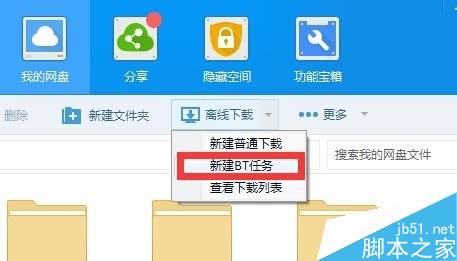 接下來再次打開“百度云管家”,點擊“離線下載”下拉列表,從其擴展菜單中選擇“新建BT任務”按鈕。
