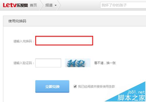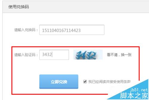 4、接著,輸入驗證碼,并勾選“我已經(jīng)閱讀并接受使用條款”,最后點擊“立即兌換”。