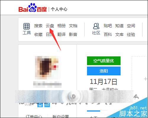 1、想要分享資源的鏈接,要先登陸百度賬號(hào)。接著打開(kāi)個(gè)人中心。在打開(kāi)的個(gè)人中心上面有一個(gè)云盤。點(diǎn)擊打開(kāi)這個(gè)云盤進(jìn)入到云盤的資源文件夾。