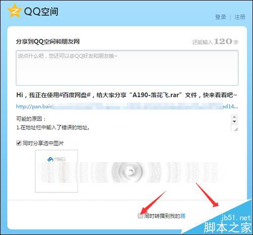 5、這時(shí),在彈出的空間的分享界面中可以選擇想要分享的選項(xiàng)。如果想要同時(shí)把分享的鏈接轉(zhuǎn)到微博的話,直接勾選下面的選項(xiàng)。如果不想轉(zhuǎn)的話,就取消前面的勾。然后點(diǎn)擊分享。