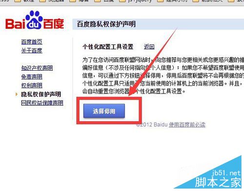 4、然后會看到一個“選擇停用”的按鈕,點擊這個按鈕就可以關閉百度網盟的廣告了。