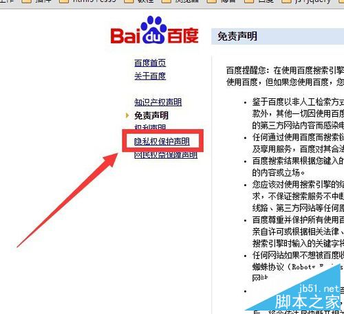 2、之后會跳轉到百度的免責聲明頁面,點擊左側菜單的“隱私權保護聲明”鏈接。