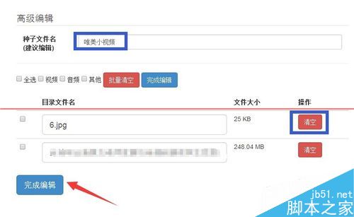 4、從打開的“高級編輯”界面中,對BT種子文件進行修改操作,其中包括修改“種子文件名”,以及對種子中的文件進行清除操作,最后點擊“完成編輯”按鈕。