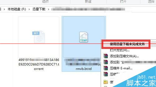 3、接下來直接切換到之前打開的“未完成任務(wù)緩存文件”目錄,此目錄至少包含兩個文件,其中擴展名為“.td”的文件即可為訓(xùn)練緩存文件,右擊此文件,選擇“使用迅雷下載未完成的任務(wù)”項。