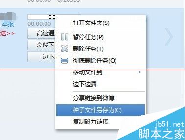 2、在迅雷“正在下載”任務(wù)列表中,找到一直處于連接資源或下載速度為0的任務(wù)并右擊,從其右鍵菜單中選擇“種子文件另存為”項,將種子文件進行保存。