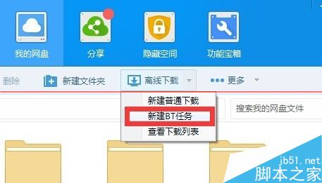 1、對于修改后的BT種子文件,我們還可以借助“百度網(wǎng)盤”或“百度云管家”來實現(xiàn)下載操作。在此以百度云管家為例,點擊“離線下載”-“新建BT任務(wù)”項。