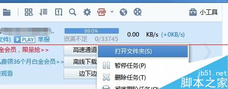 1、當(dāng)迅雷在下載資源過程中(通常為下載完成度達到99%時)出現(xiàn)下載速度為0,針對此類問題,我們可以通過以下方法來解決。右擊下載速度為0的任務(wù),從其右鍵菜單中選擇“打開文件夾”項。