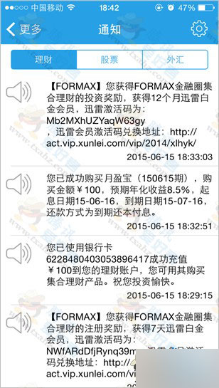 6、進官網地址 http://wealth.jrq.com/ 下載APP(或者手機助手/appstore 直接搜索下載“金融圈”),登錄自己的帳號 - 更多 - 通知里面可以看到迅雷會員1年VIP激活碼+7天的激活碼。